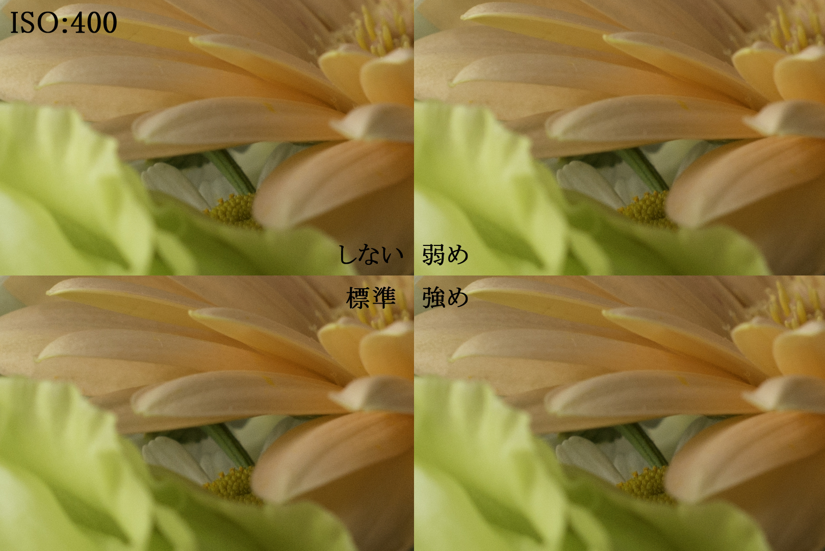 ISO感度:400では、「高感度ノイズ低減:弱め」が丁度良いですね。