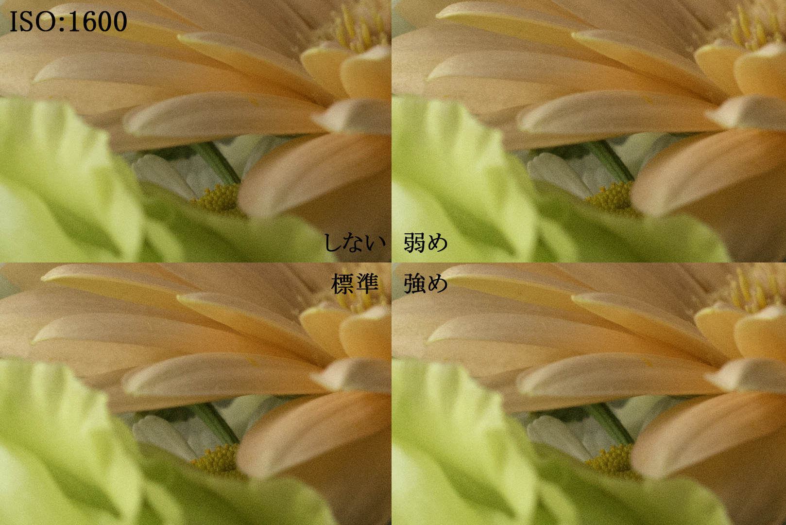 ISO感度:1600では、ここまでくると「高感度ノイズ低減:強め」でないと、ノイズが低減出来ないですね。