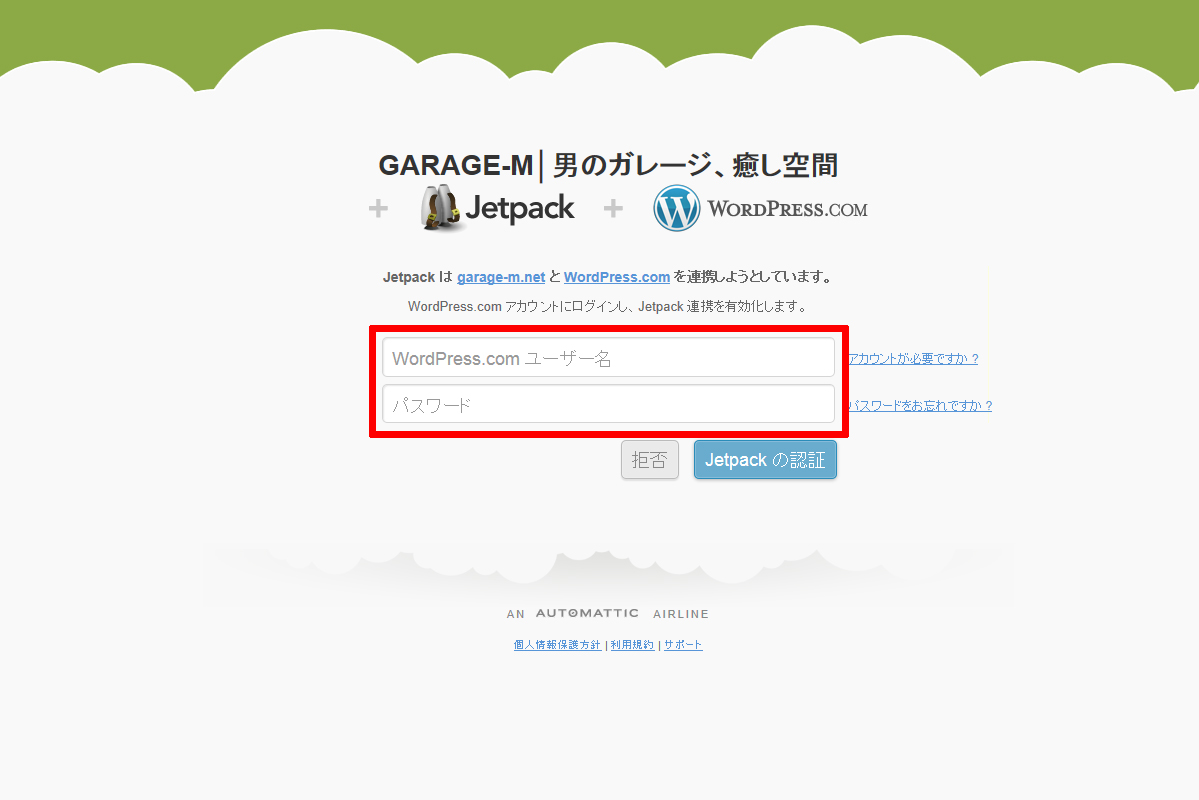 これは以前、WordPressをスパムから守ってくれる「Akismet」設定をインストールした時に、キーを入手しましたよね、その時に「ユーザー名」と「パスワード」は設定してますので、それを入力すると「WordPress.com」と連携できます。
