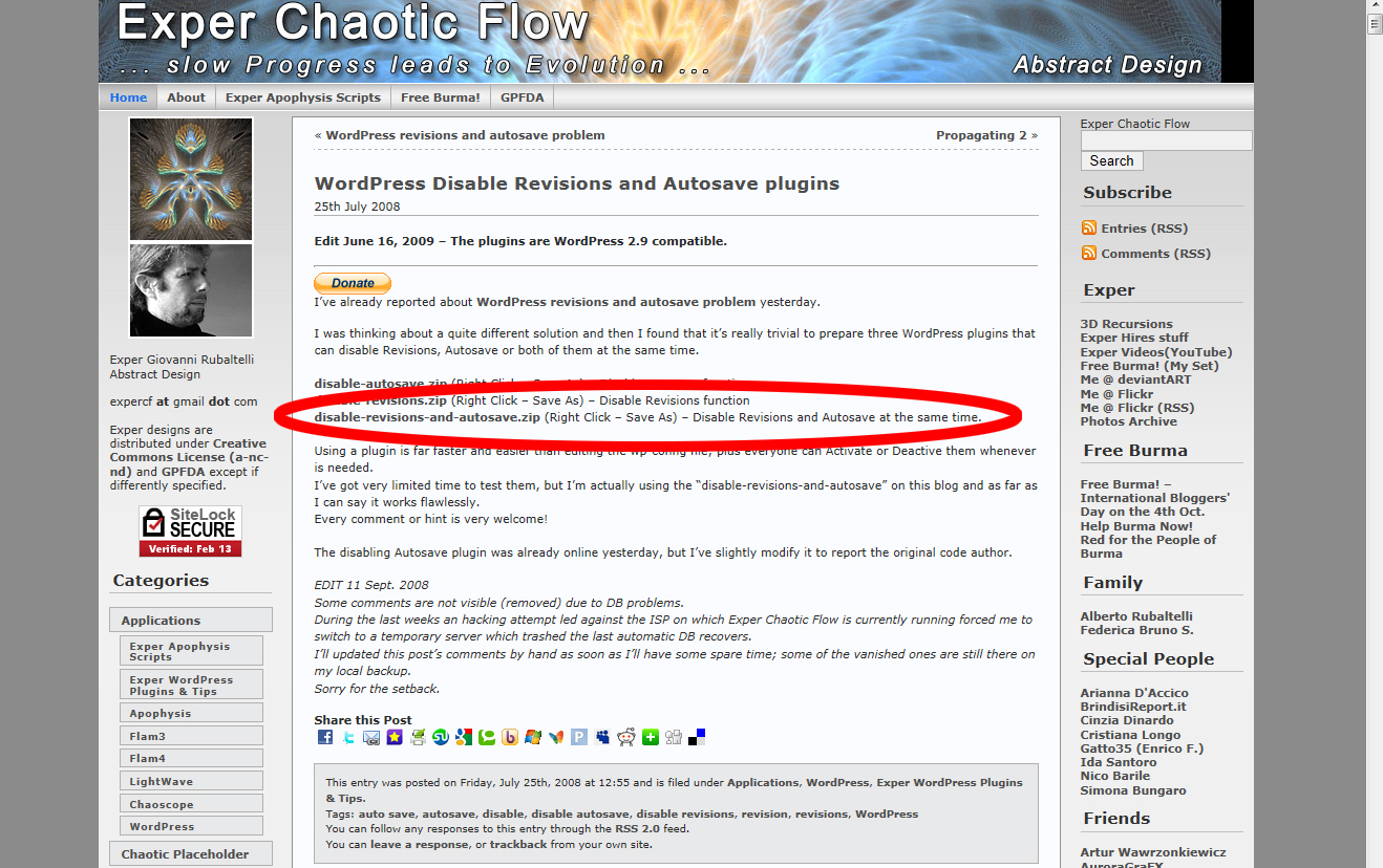このプラグインはダッシュボードの「プラグイン>新規追加」での検索では出てきませんのでここから「Disable Revisions and Autosave plugins」をダウンロードします。