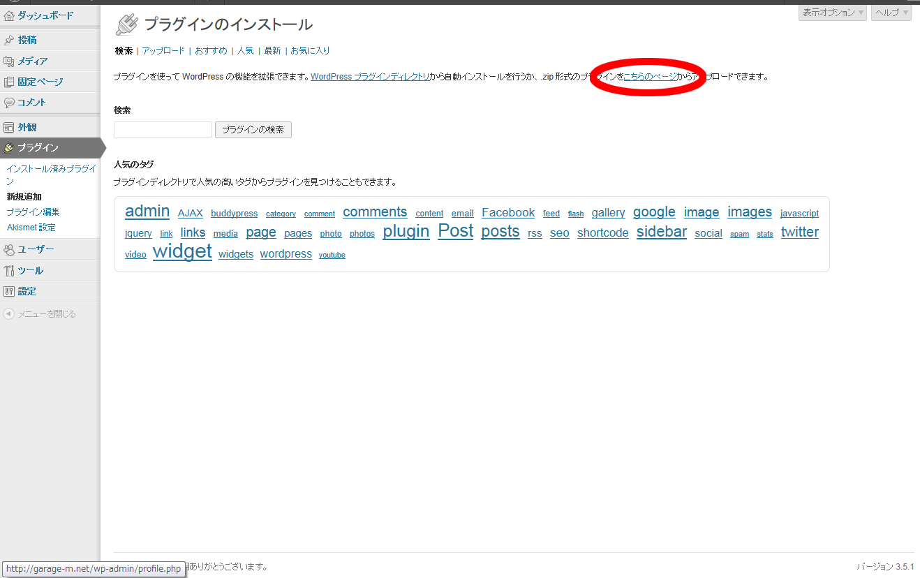 ダウンロードしたら「ダッシュボード>プラグイン>新規追加」ページの「こちらのページ」からをクリックします。