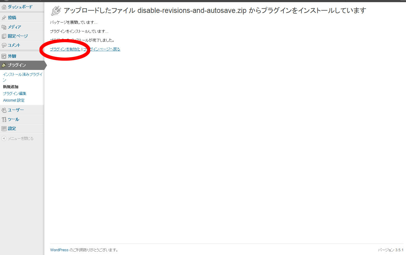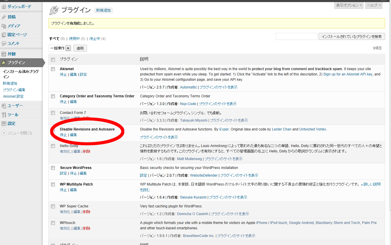 このように「Disable Revisions and Autosave」が表示されたら作業は終了です。